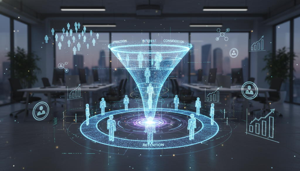 Un embudo de adquisición clientes es el mapa visual del viaje del cliente desde el primer contacto hasta la lealtad continua, midiendo fugas en cada etapa para optimizar conversiones. No es solo «atraer y vender»: es un sistema integral que alinea marketing, ventas y customer success para un crecimiento compuesto.